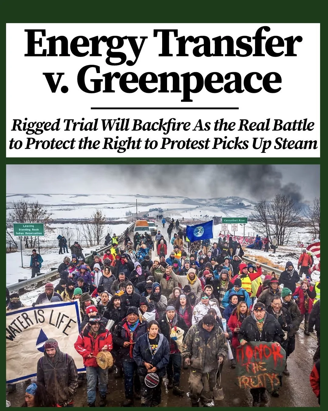 Greenpeace has alleged that Energy Transfer’s $300 million claim against the environmental group is a SLAPP harassment effort designed to silence the organization and weaken the entire climate justice movement. The rights of free speech and fair trial are at stake - not just for Greenpeace, but for all advocates regardless of political orientation. Please come here for regular updates.